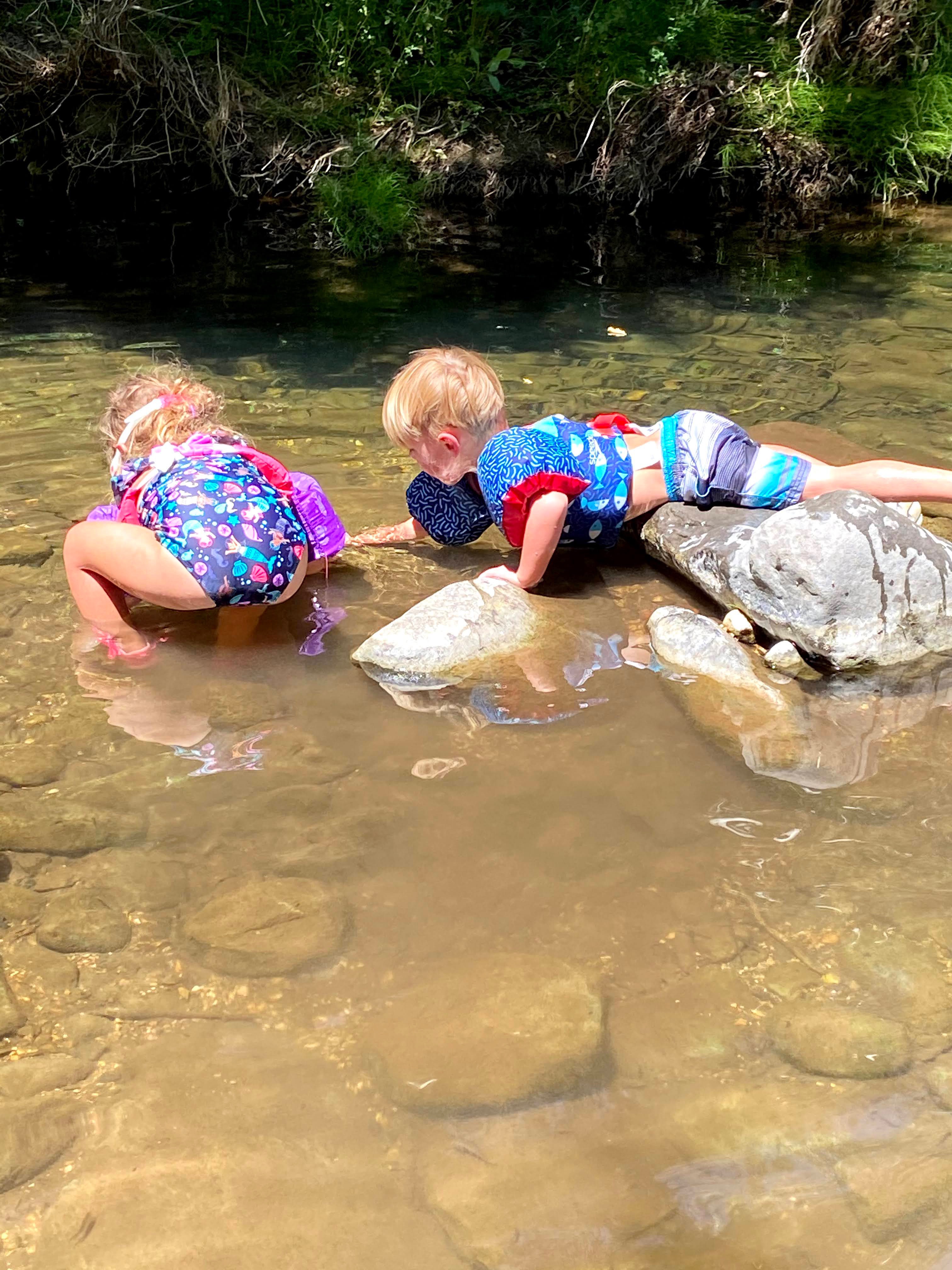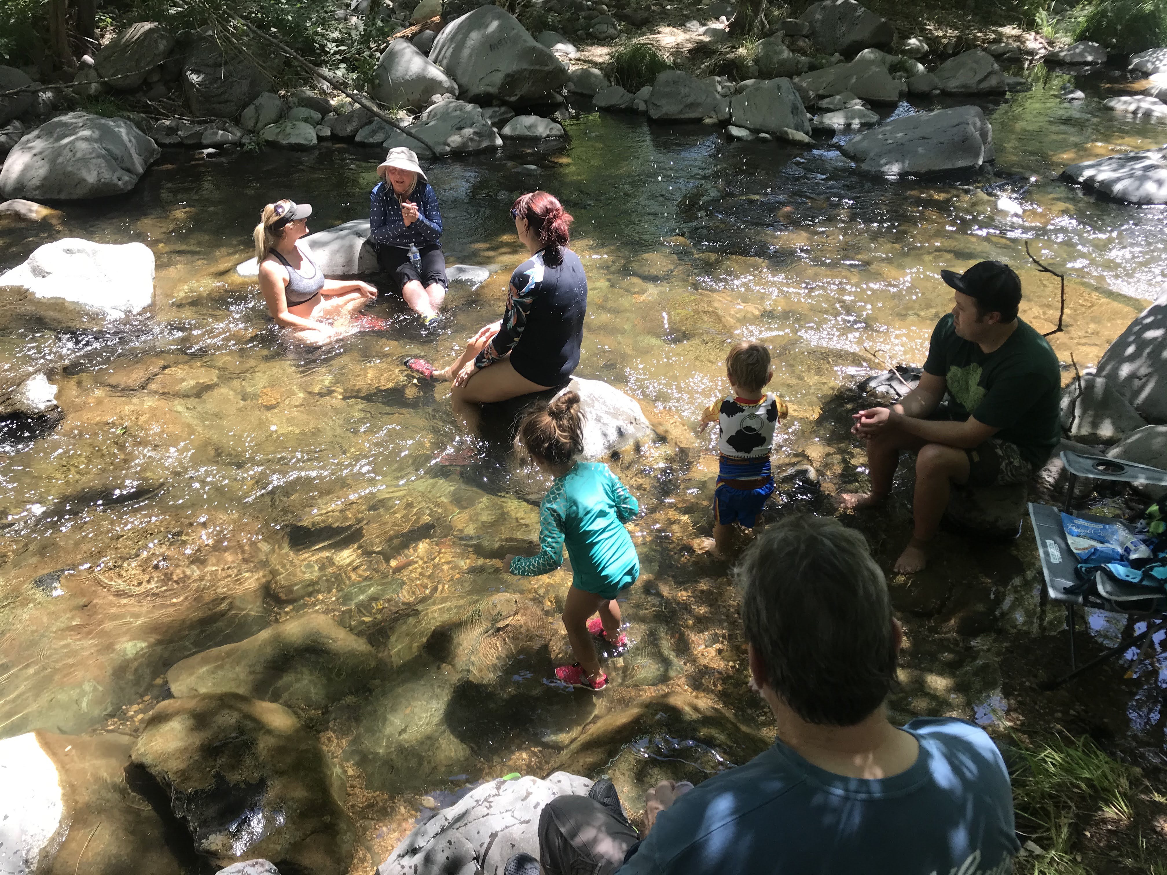 At first when we got all of our stuff and cross the road which by the way you have to be very careful because it’s very busy with cars, we had to carry our kids by hand and all of our stuff. Which and it being totally worth it. We got to the edge and where we climb down wasn’t the best place at first. We slid down and almost broke our butts carrying the kids down, but once we got down to the creek it was amazing to be hold.