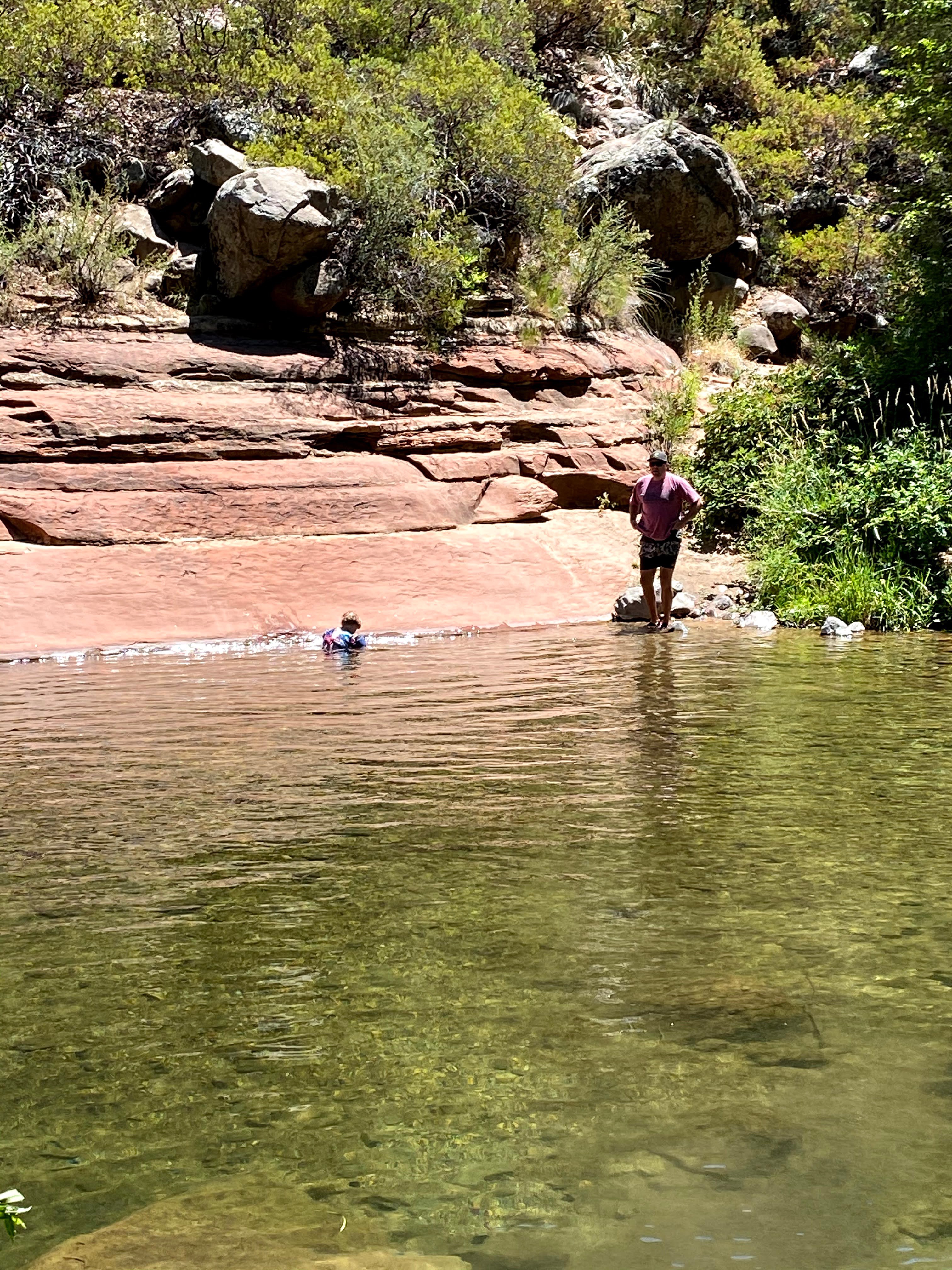 We got the kids in their bathing suit‘s and their swim floaty’s and decided to explore. We went up the creek another 50 or 60 feet when we came upon the most beautiful portion of the entire creek, a miniature slide rock area with red rock and a big giant portion of the river that was just so calm and peaceful that the kids and I loved swimming through it.