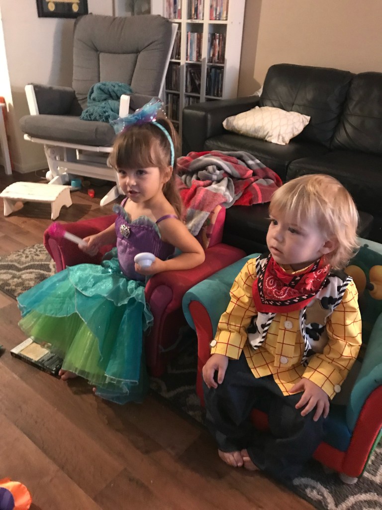 Livi became a mermaid / princess ( which I am so proud) and Will became a toy story ( mostly woody) and Mickey buff. Still very proud. When I found out I was going to have a girl, I went straight into the Disney Store and bough like 5 different onesies for her to have her first Halloween. During that day she was Cinderella, Marie ( the cat) and MINNIE. Her next Halloween she was Belle during the day but we went super hero for the night. Wills first Halloween he was Mickey and Livi was Tinkerbell. The next year he was WOODY and she was ARIEL. Course last year we went traditional and they were a Black Cat and a WEREWOLF. This year, so far ( from what LIVI has chosen) she wants to be MINNIE again and wants Will to be MICKEY with her. I think it will be cute.