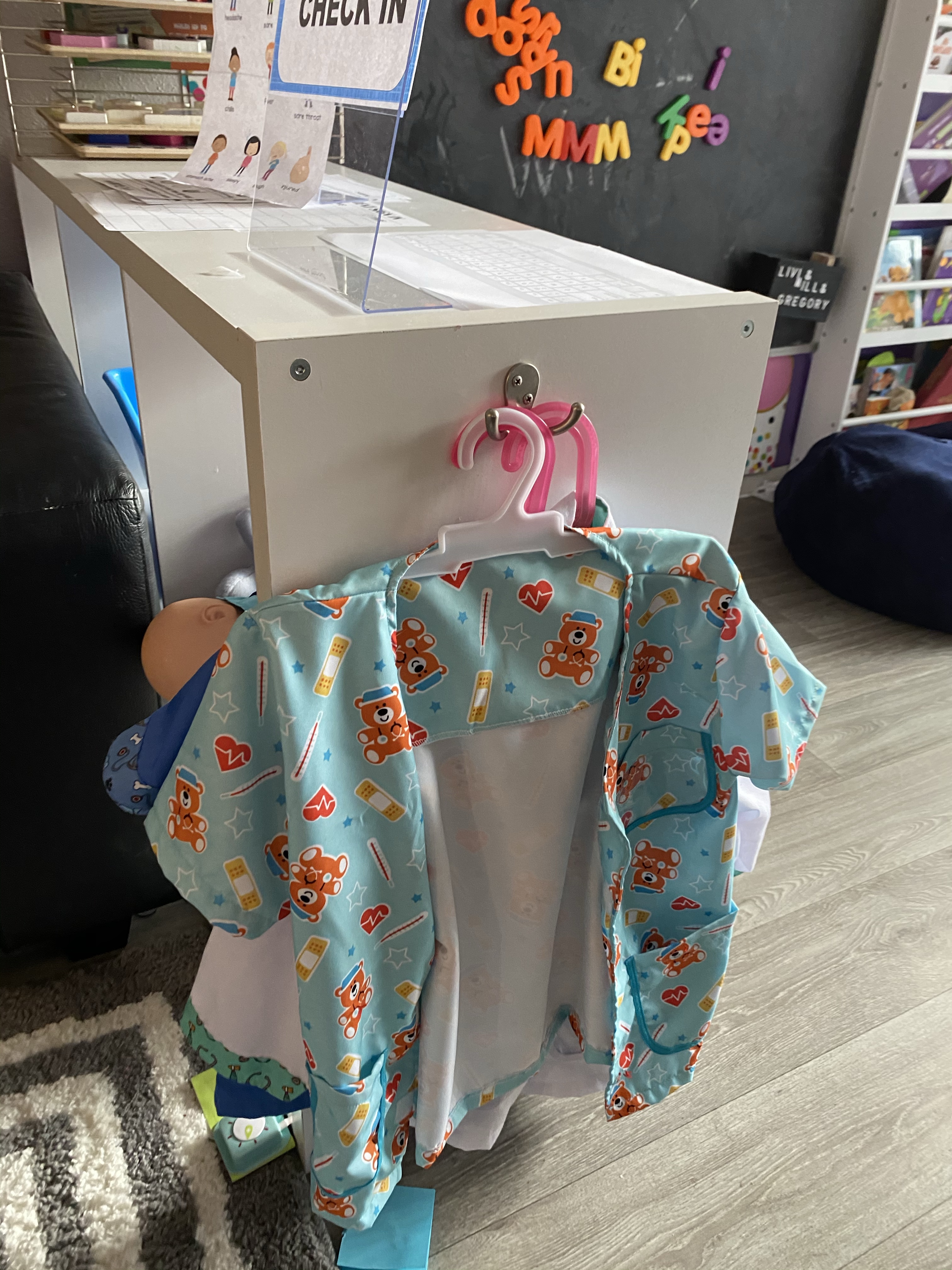 As far as Pretend clothes go, I have found over the last few months at HOMEGOODS, TARGET, BURLINGTON, etc, some of MELISSA AND DOUGS doctor sets. They are full price about 25.00 a set, but if you go to homegoods, or Burlington, or any second hand store, you might find them for cheaper. Especially now during Halloween season. Doctor costumes and shirts. If it is still too much for you, just go to GOODWILL or even your hubbies closet and pull down his old WHITE SHIRTS, and let the kids turn them into lab coats. Put name tags on them.