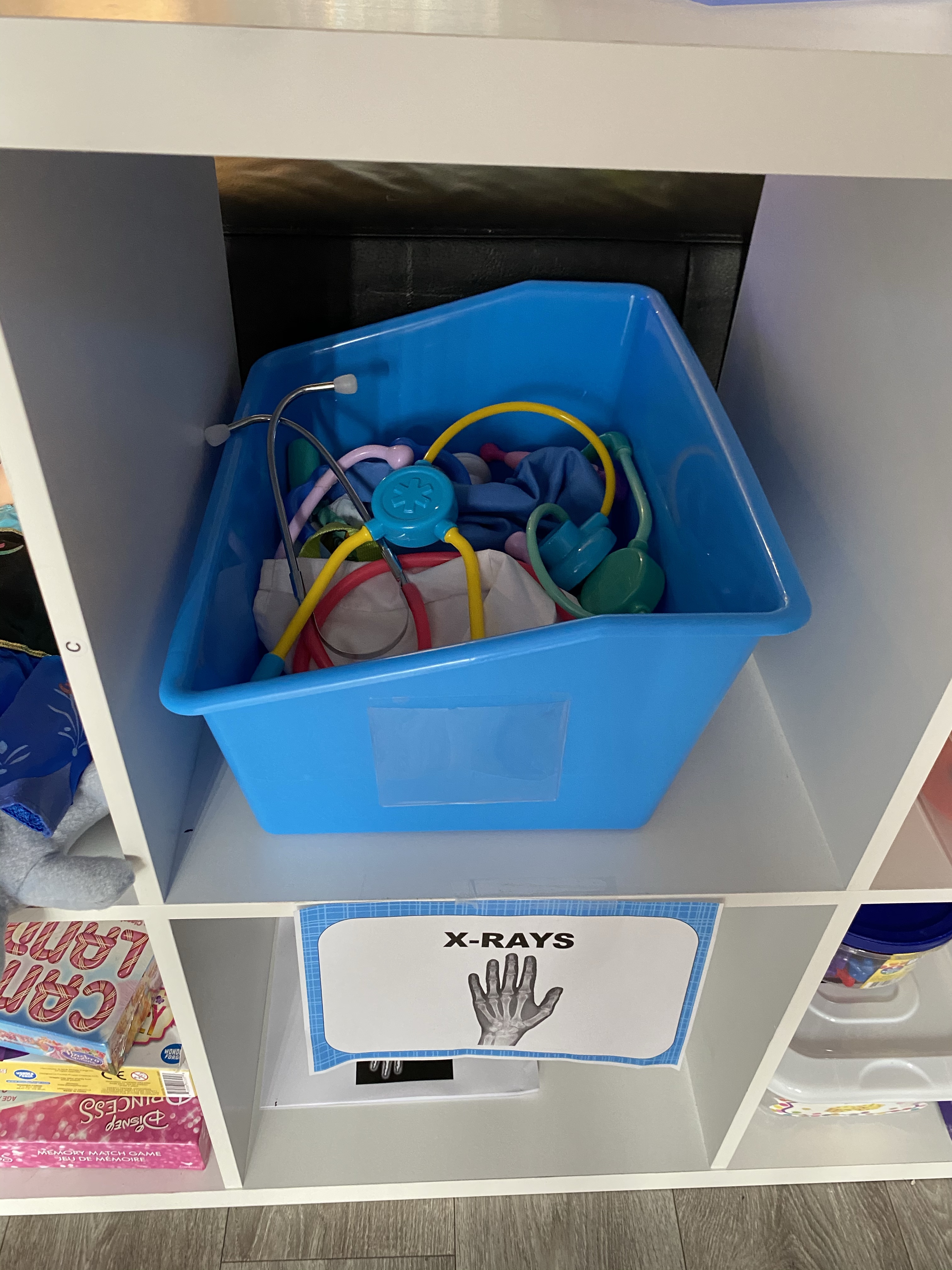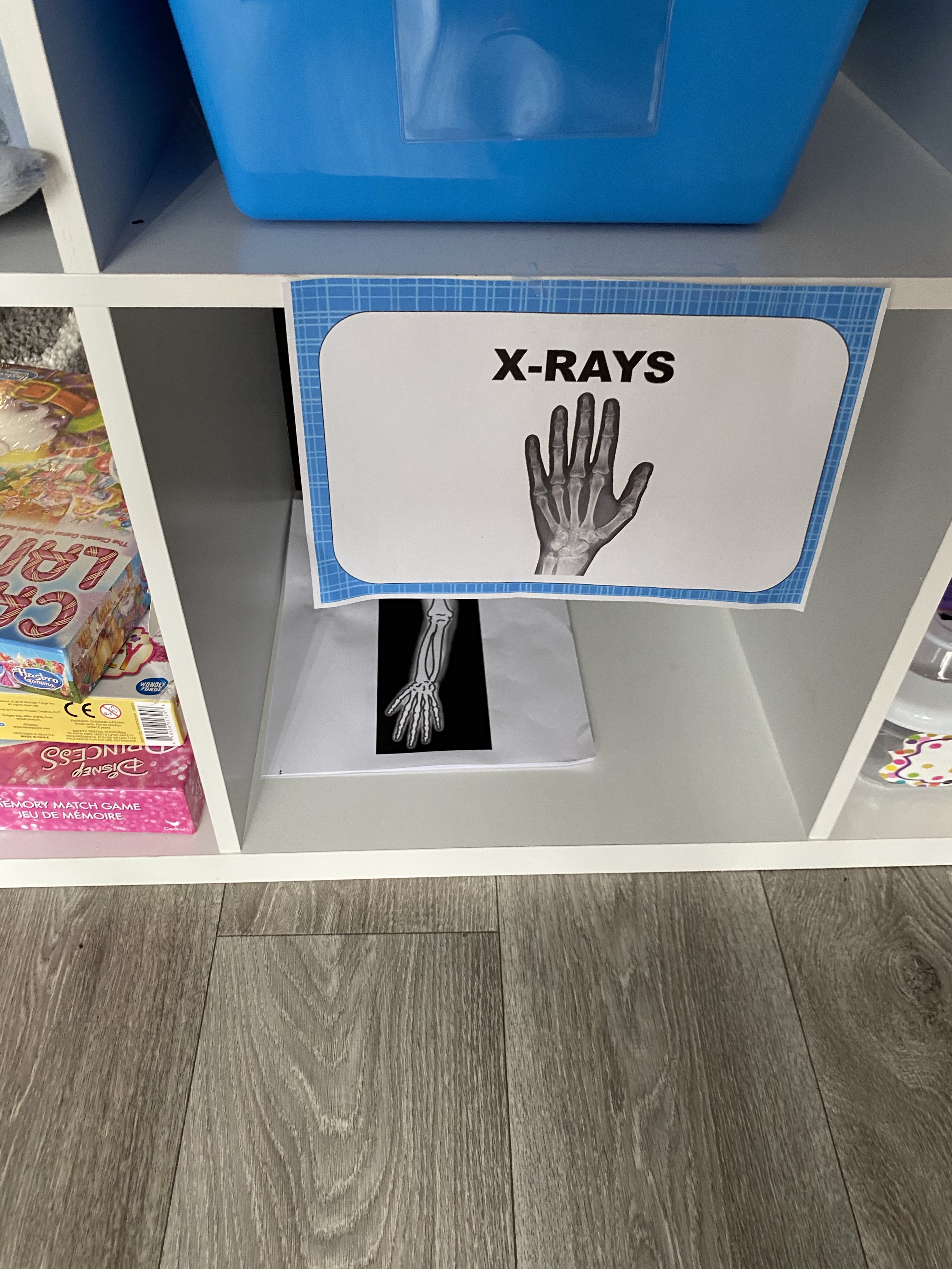 Another cool thing to do is set up a clear storage box, ( I have yet to do this yet) put battery Christmas lights inside it and it can become the x-ray light box. Just print off pretend play x-rays, and they will light up. You can also make it for your magnetic blocks.