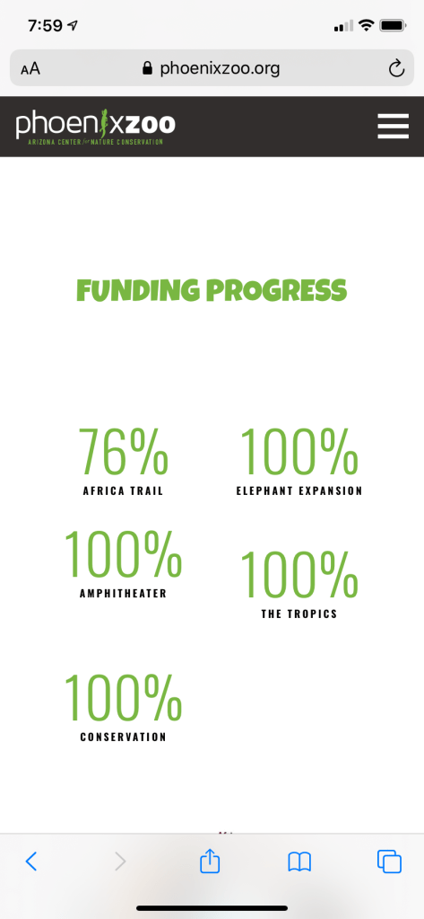 Now remember that the Phoenix zoo relays on donations to fund their zoo. It’s a non profit organization. So right now, the only thing left to help donate to is the African trail and it is at 76%.