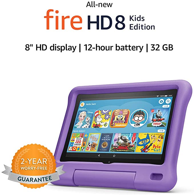 We currently have the 10″, but we started with the 8’s and they are amazing. They now have a kick stand on the back to let your kids stand them up on the table to do their school work on or read digital books, or play games.