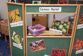 With the farmers market, like my curriculum provides, I am just going to use the kids play food. Put into baskets and use the whole play pintables that they have. This will be my set up below.