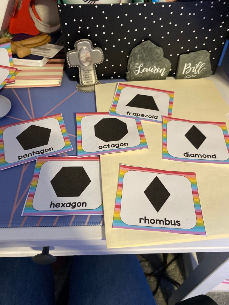 However It is just a slight note to me to remember that their math skills are growing and shapes is a major part of it. Next after the new year, after they have mastered these shapes will be 3D shapes.