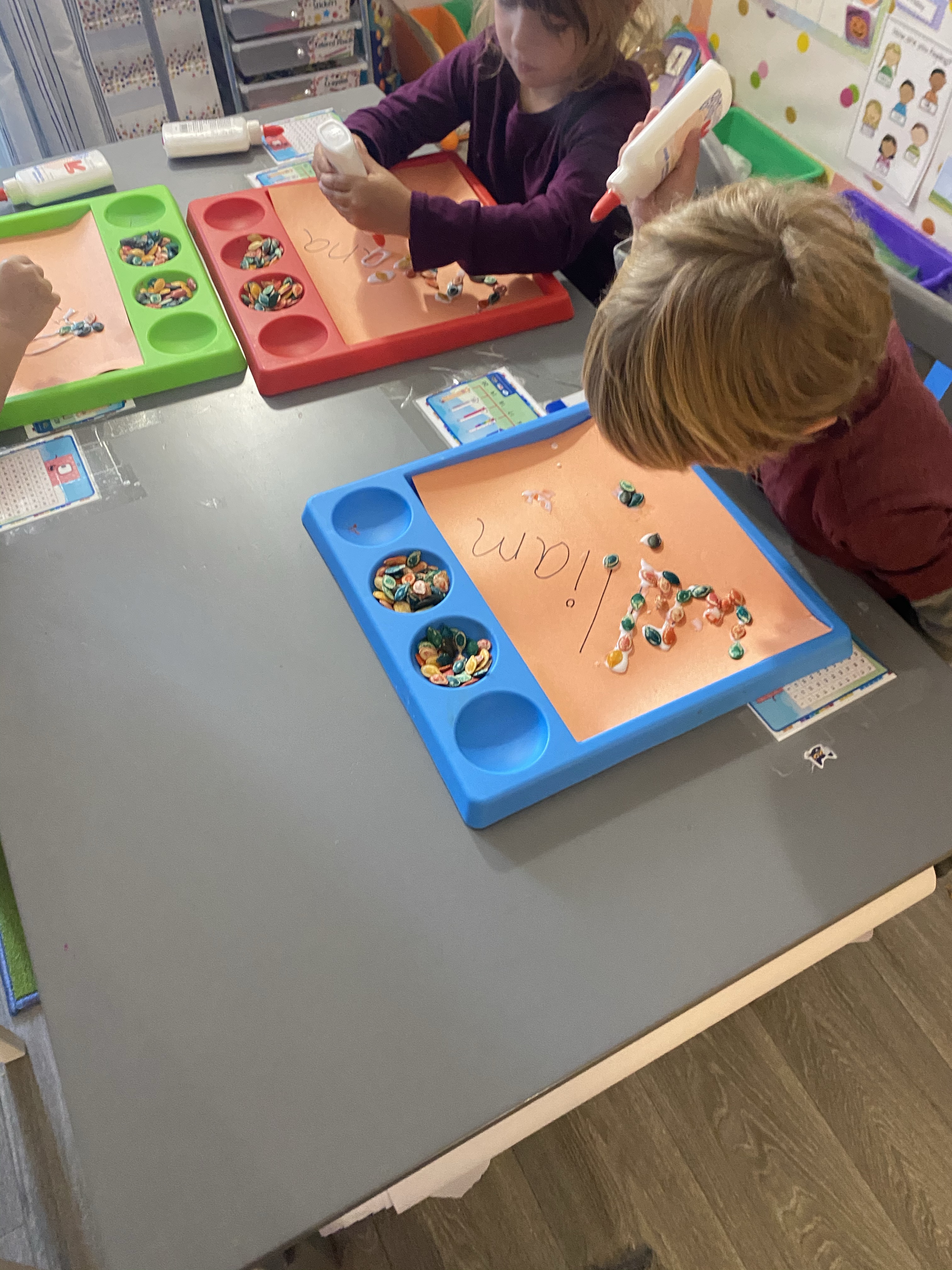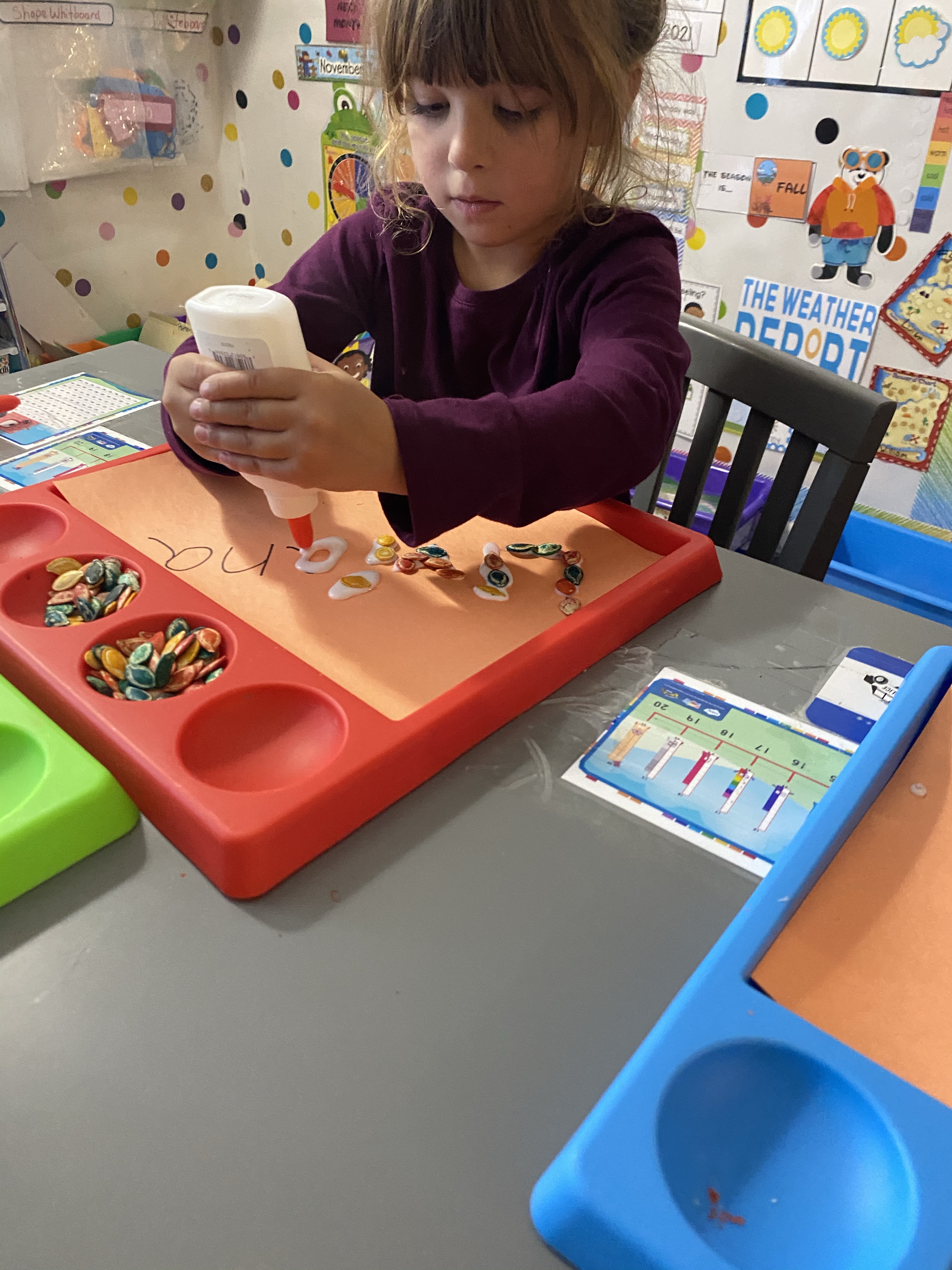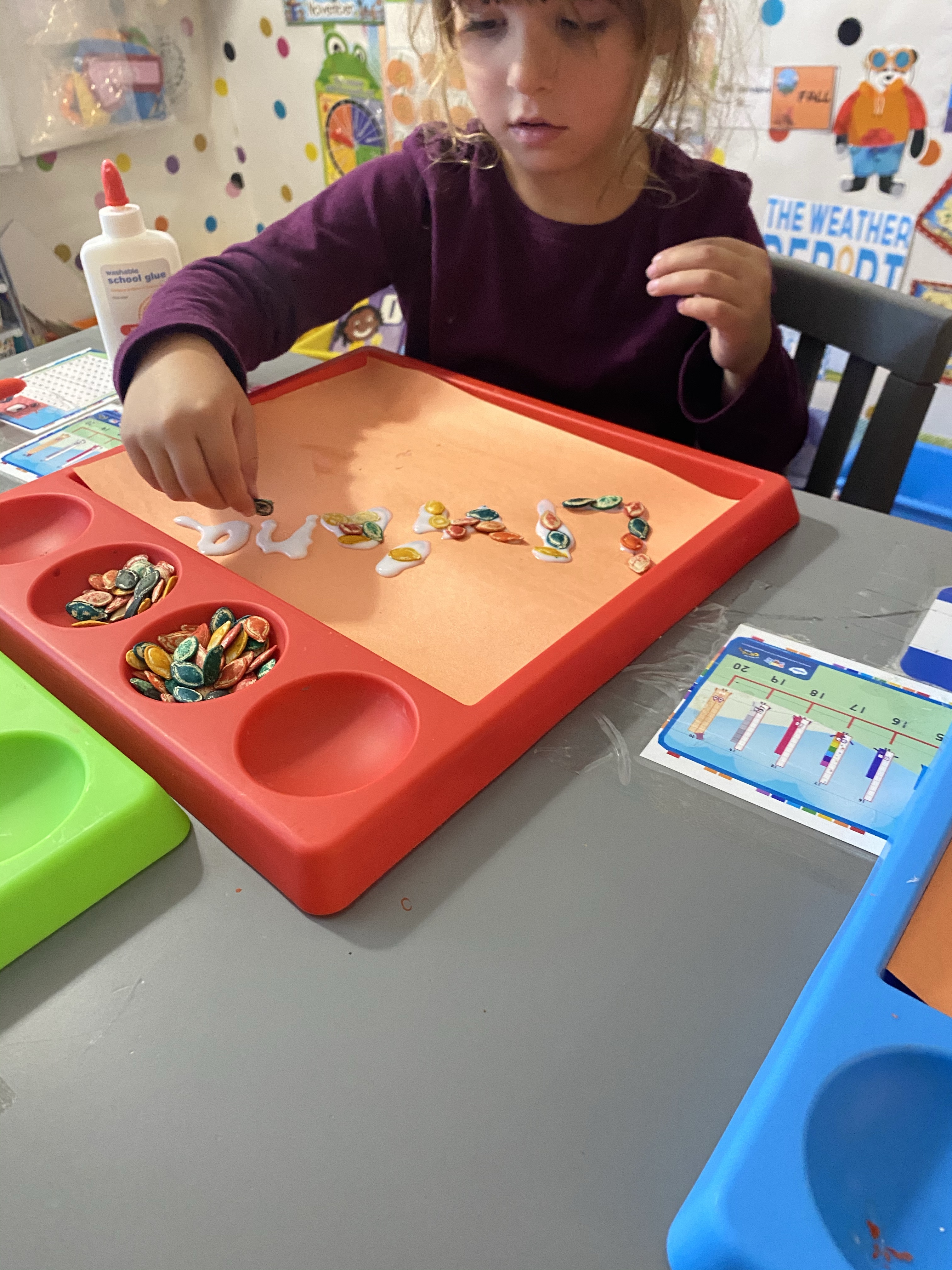 I’ll say this. They loved their art projects more than anything. They all did a great job with their names out of pumpkin seeds.