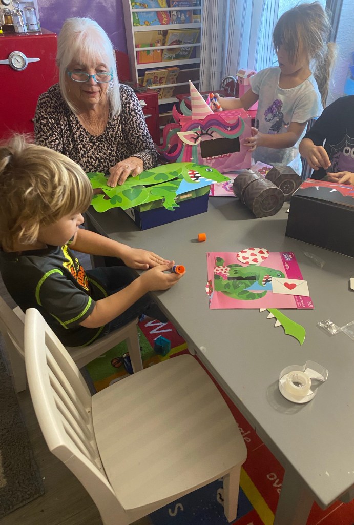We had a special guest come to help. Lol. My mom. Now we went with the already Valentine’s kits to decorate their shoe boxes. And they all went well.
