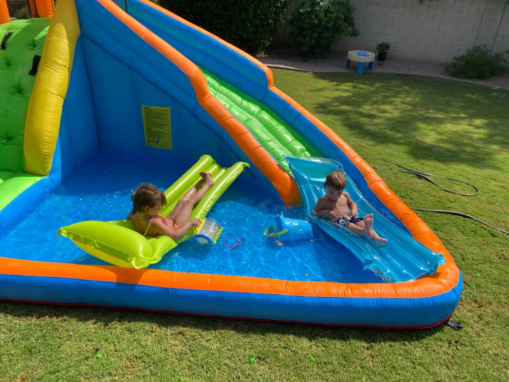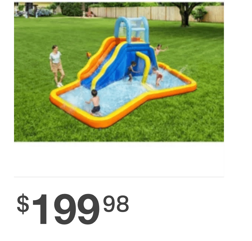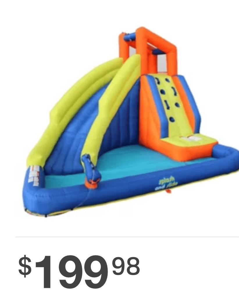 We bought this from Walmart. It’s a inflatable water slide. It wasn’t that expensive. It didn’t come with a pump, but we already had one from the last water slide we had from the previous two summers. It just went rotten with mold, so we got this one. About 200.00. Which by the way is the price of a new water slide at Sams Club with the pump.