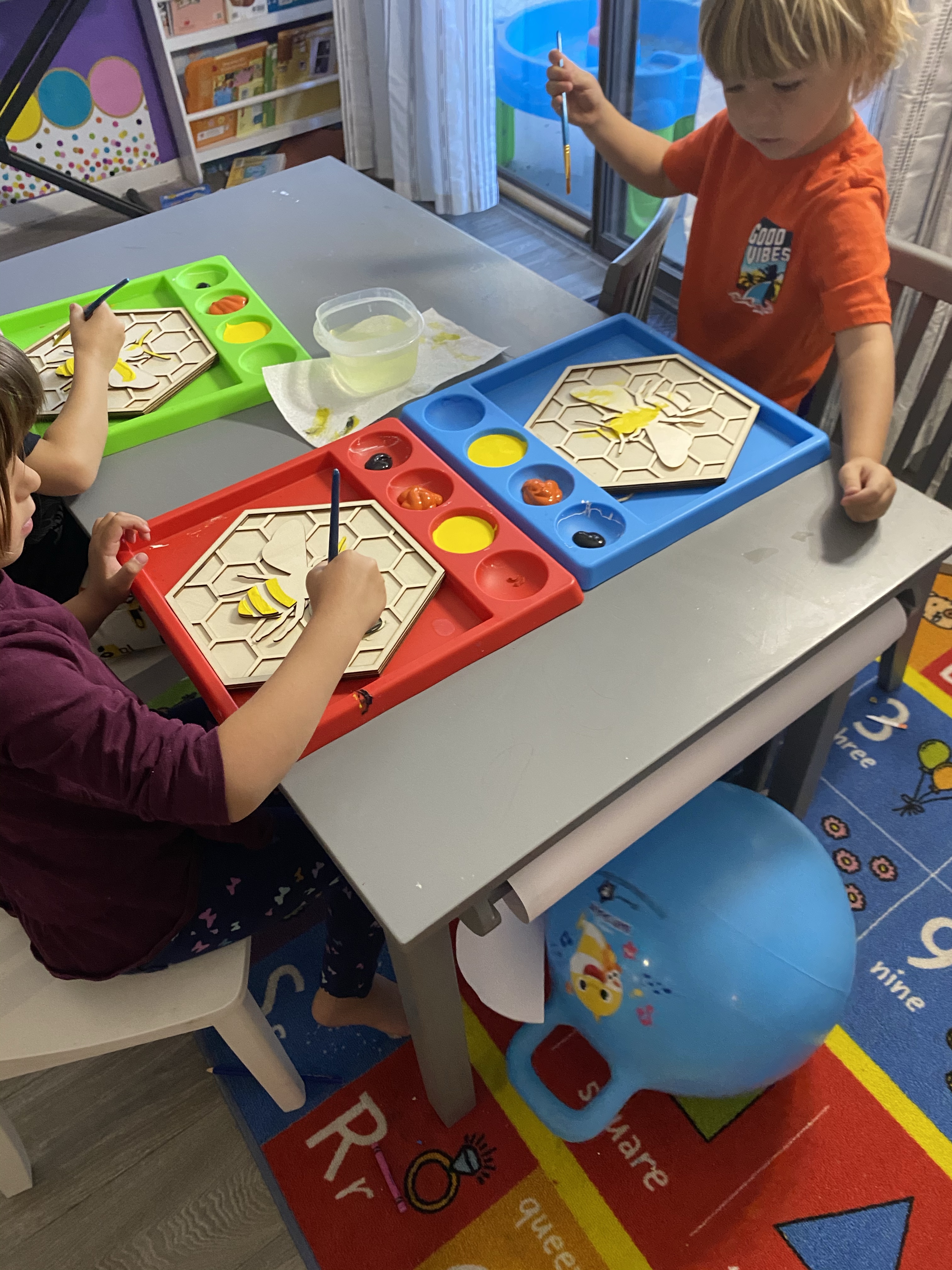 We did all the vocabulary and we also did a great art project. I found at joanns a bunch of wood art for them to paint and then hang them on the walls. They were so good about what parts of the bee to paint yellow and black.