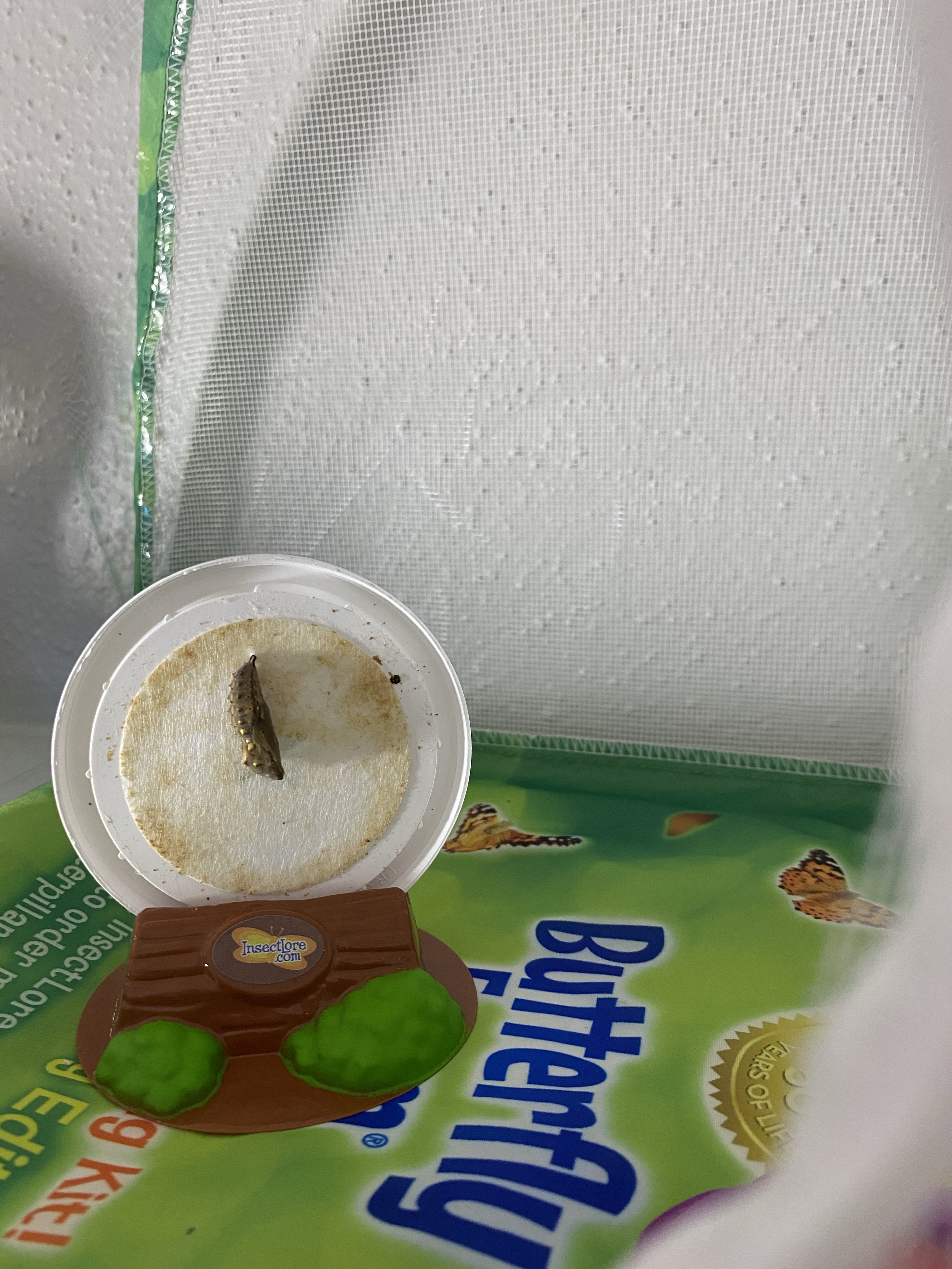So far our 5 guys are growing nice and big. They guarantee at least 3 will turn into butterflies. I’m thinking we get a full batch. Our one little guy has made it all the way to his chrysalis now he’s inside the butterfly net while we wait for him to turn for another 5 to 10 days.